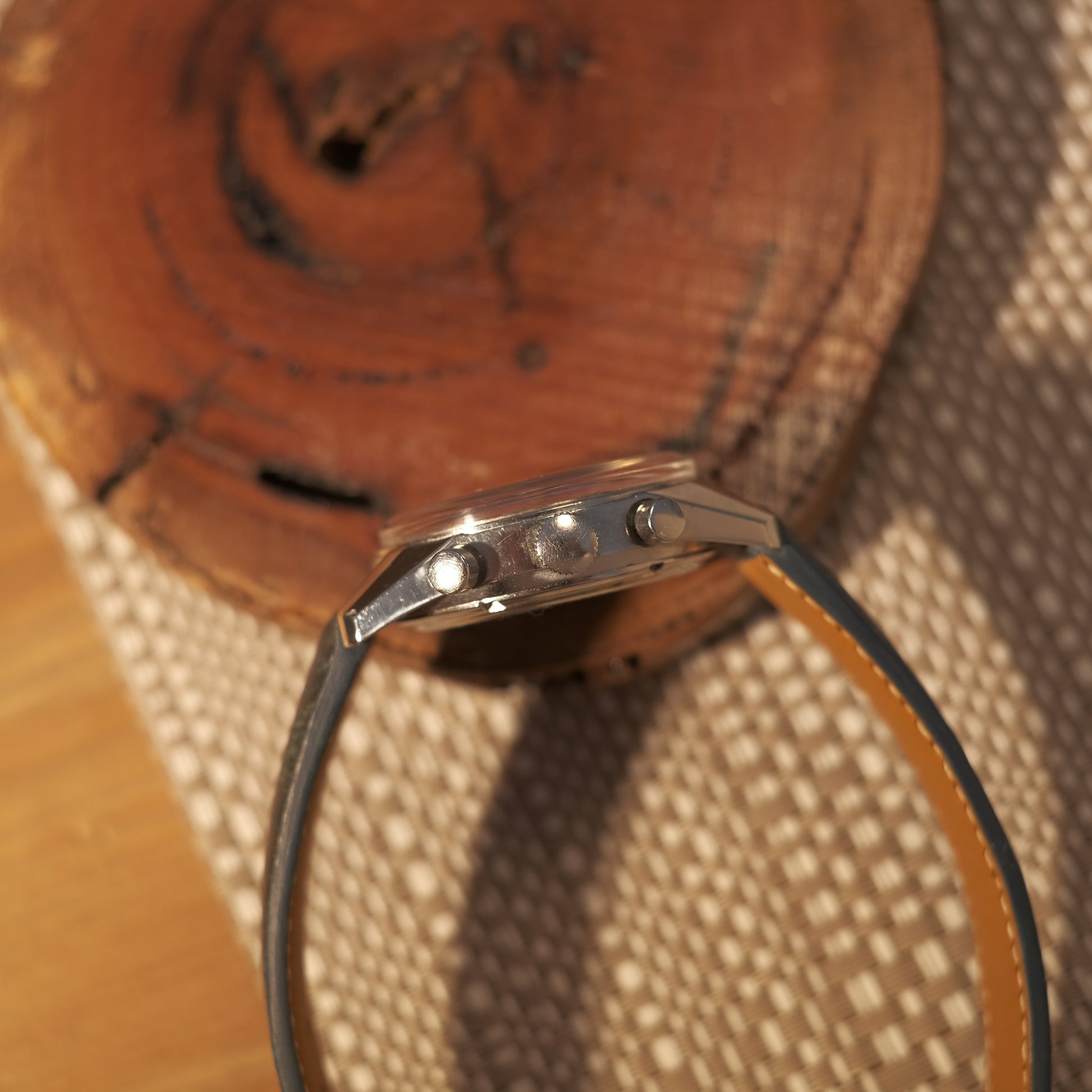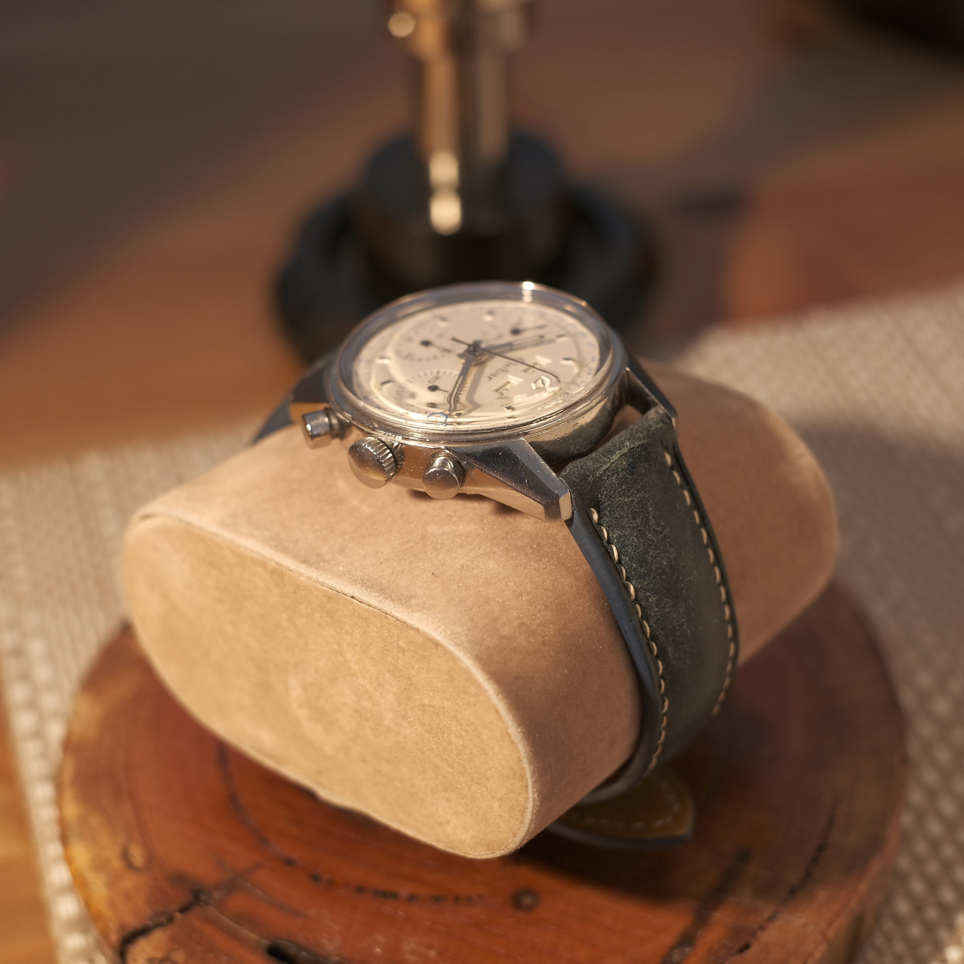 Sold in “good vintage” condition with an aftermarket strap; this fine vintage triple date chrono features relumed hands & has presumably been serviced recently with marks on the internal caseback; case has been polished.