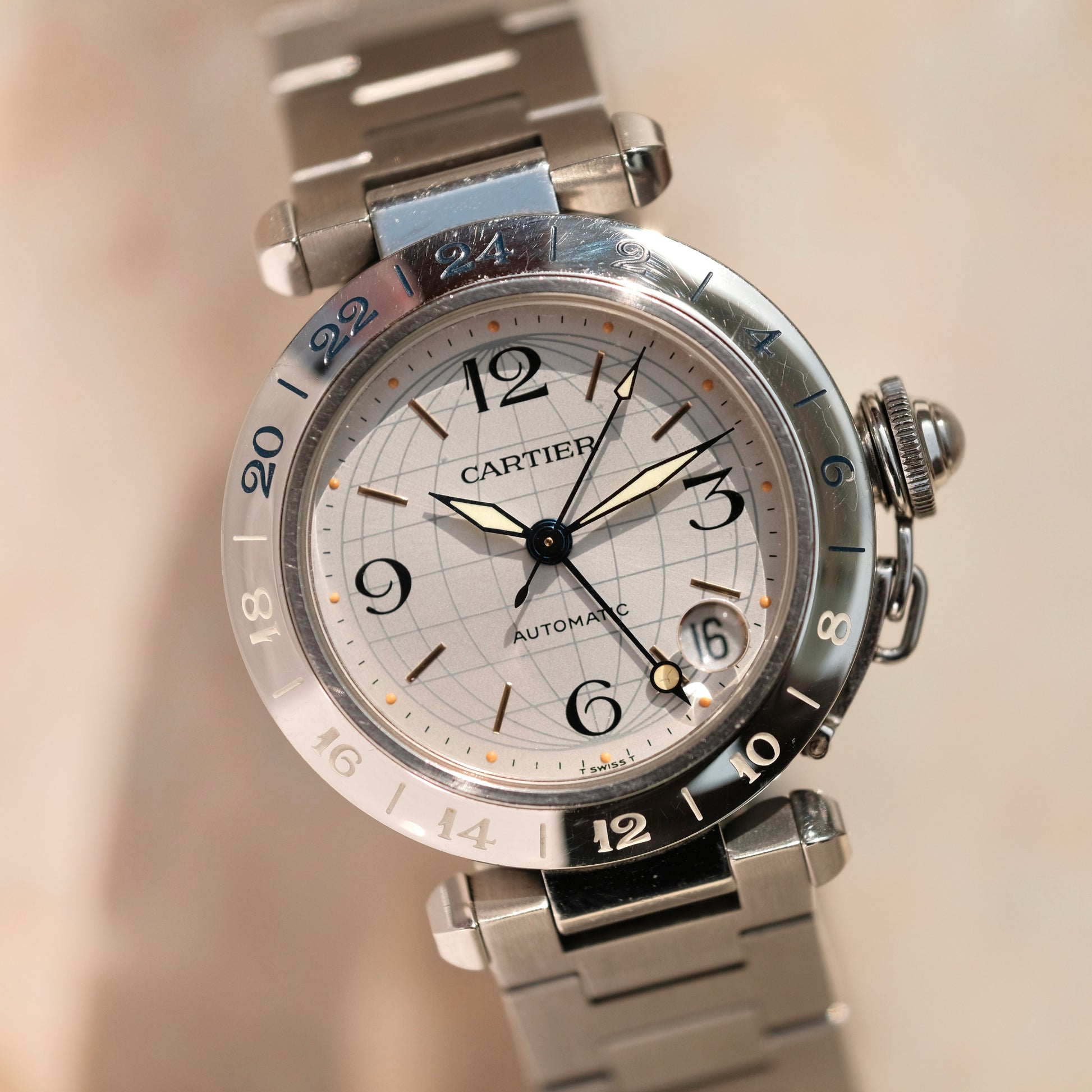 On offer today is a fine, rare & elegant traveller’s wristwatch from Cartier - the Pasha C Gmt ref 2377.