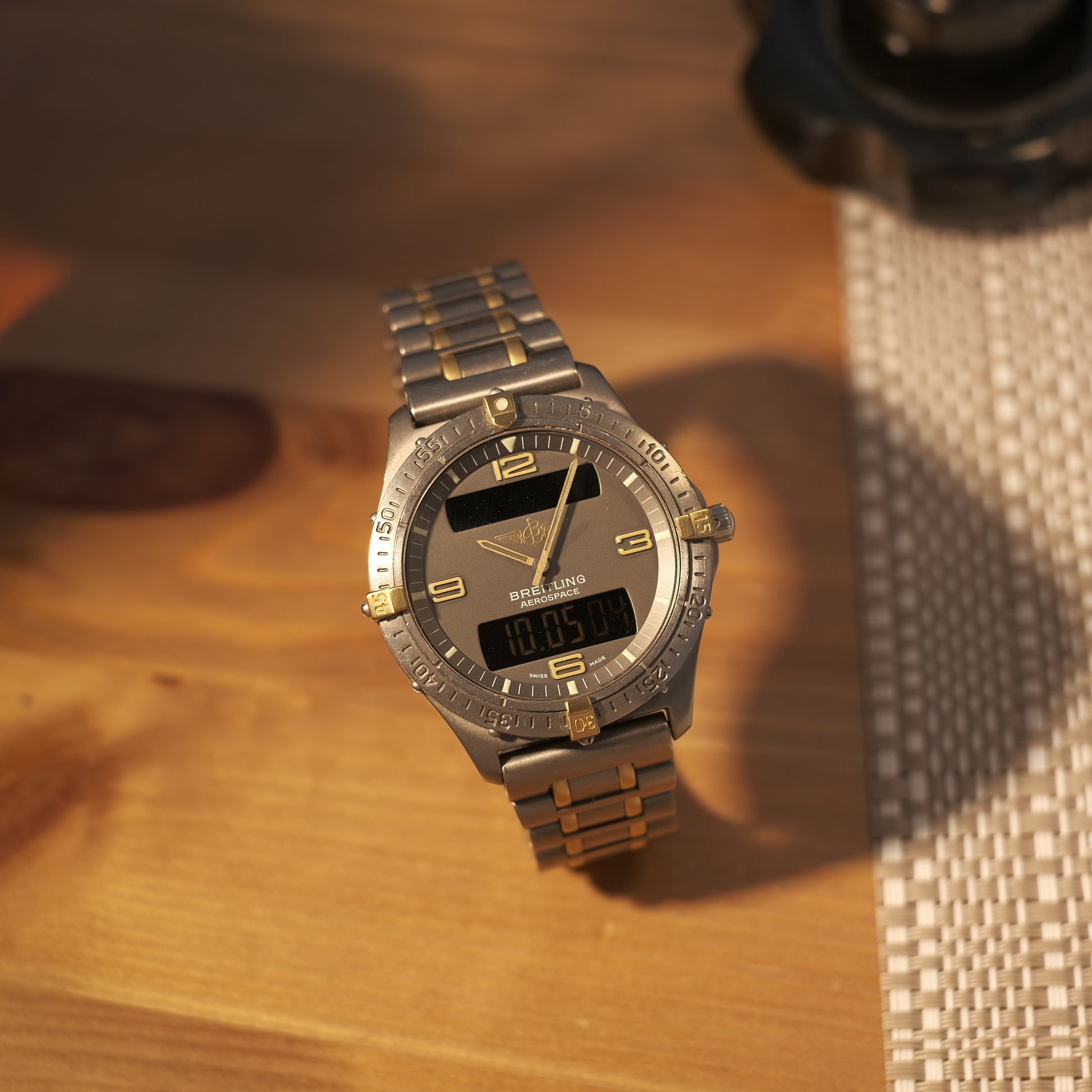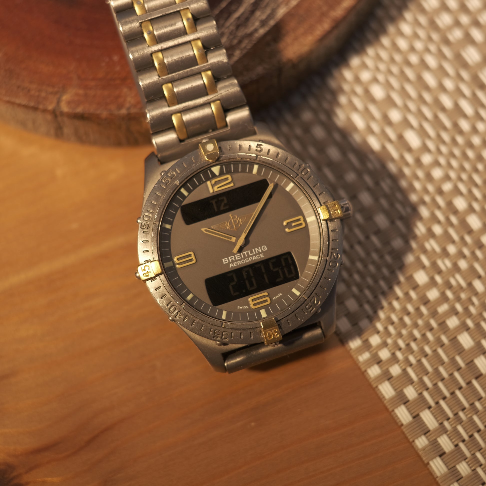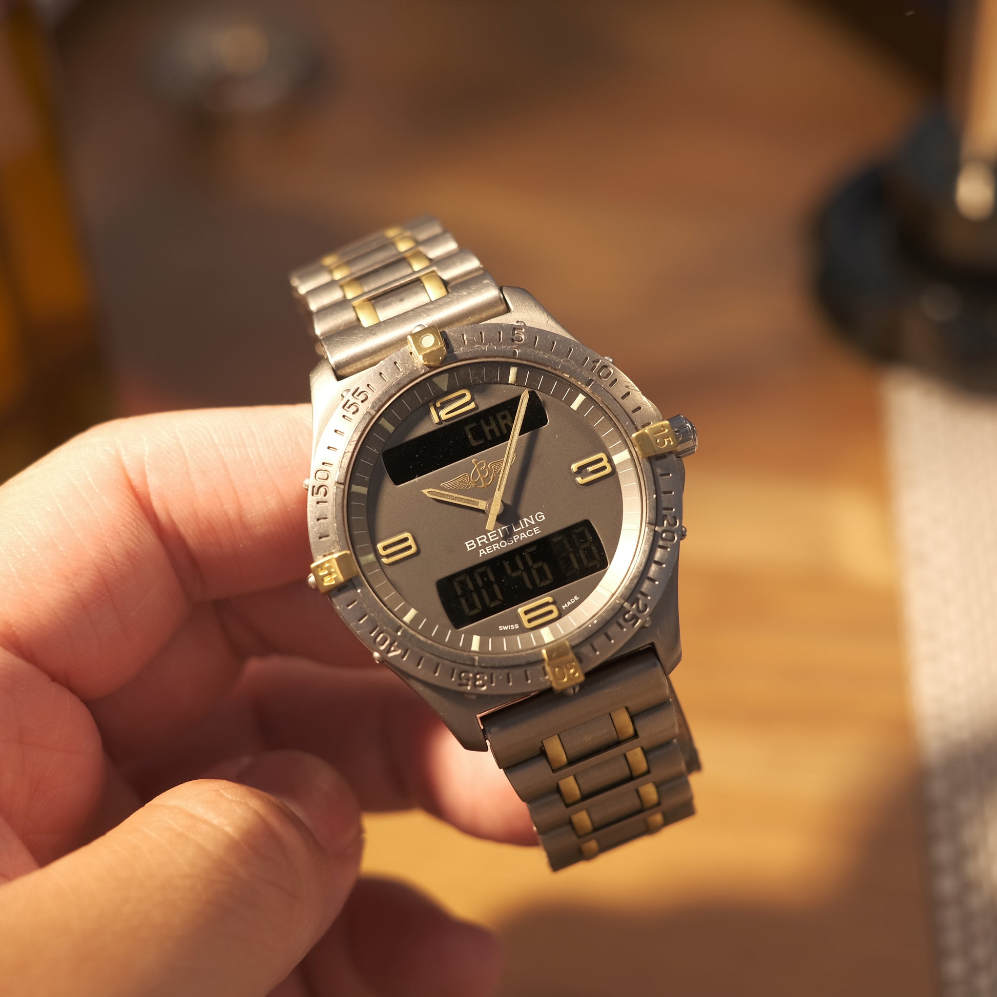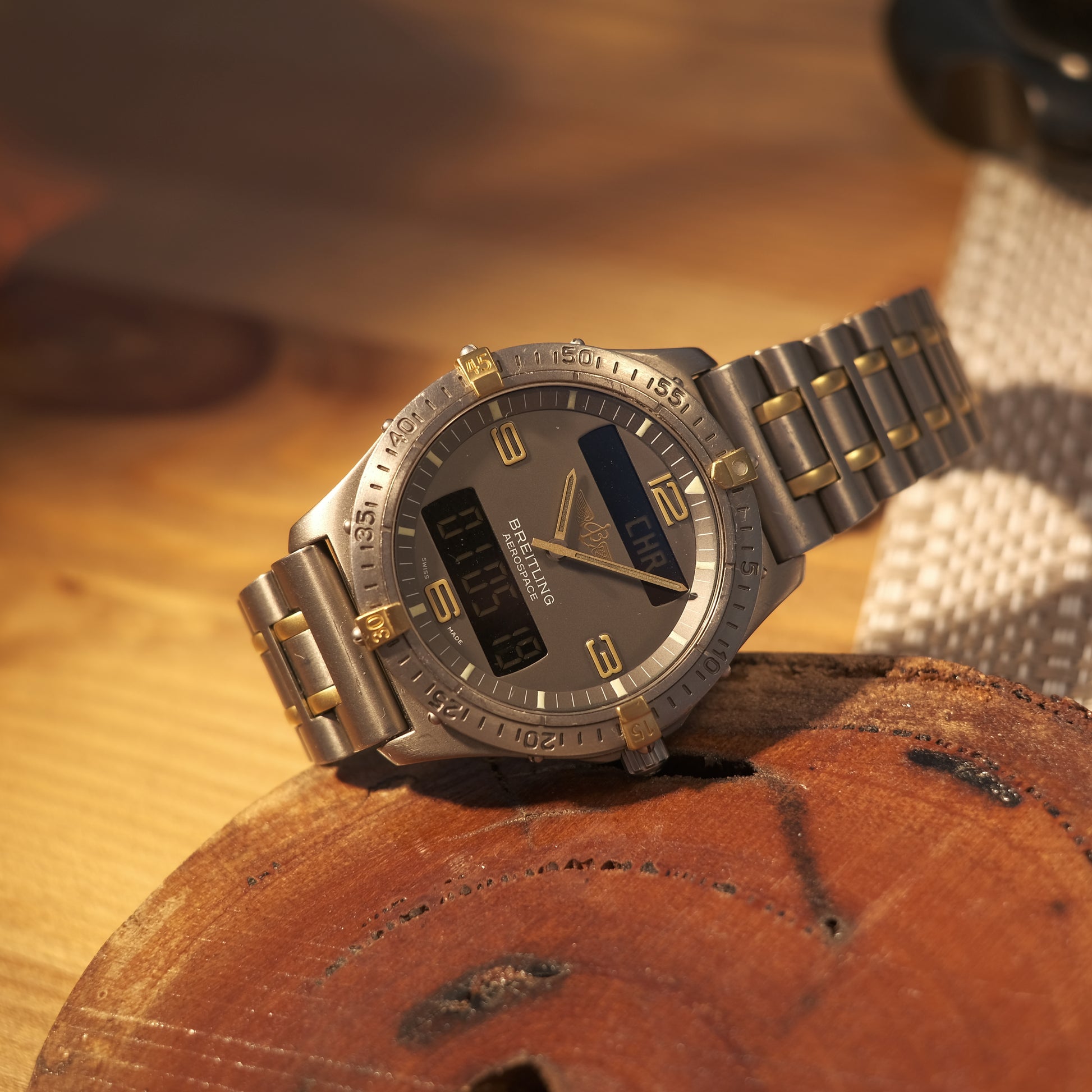 On offer today is a quirky & rare vintage Ana-Digi multi-complication pilot’s watch - The Breitling Aerospace in titanium & 18k Gold; ref F56062 with the rare Rouleaux bracelet.