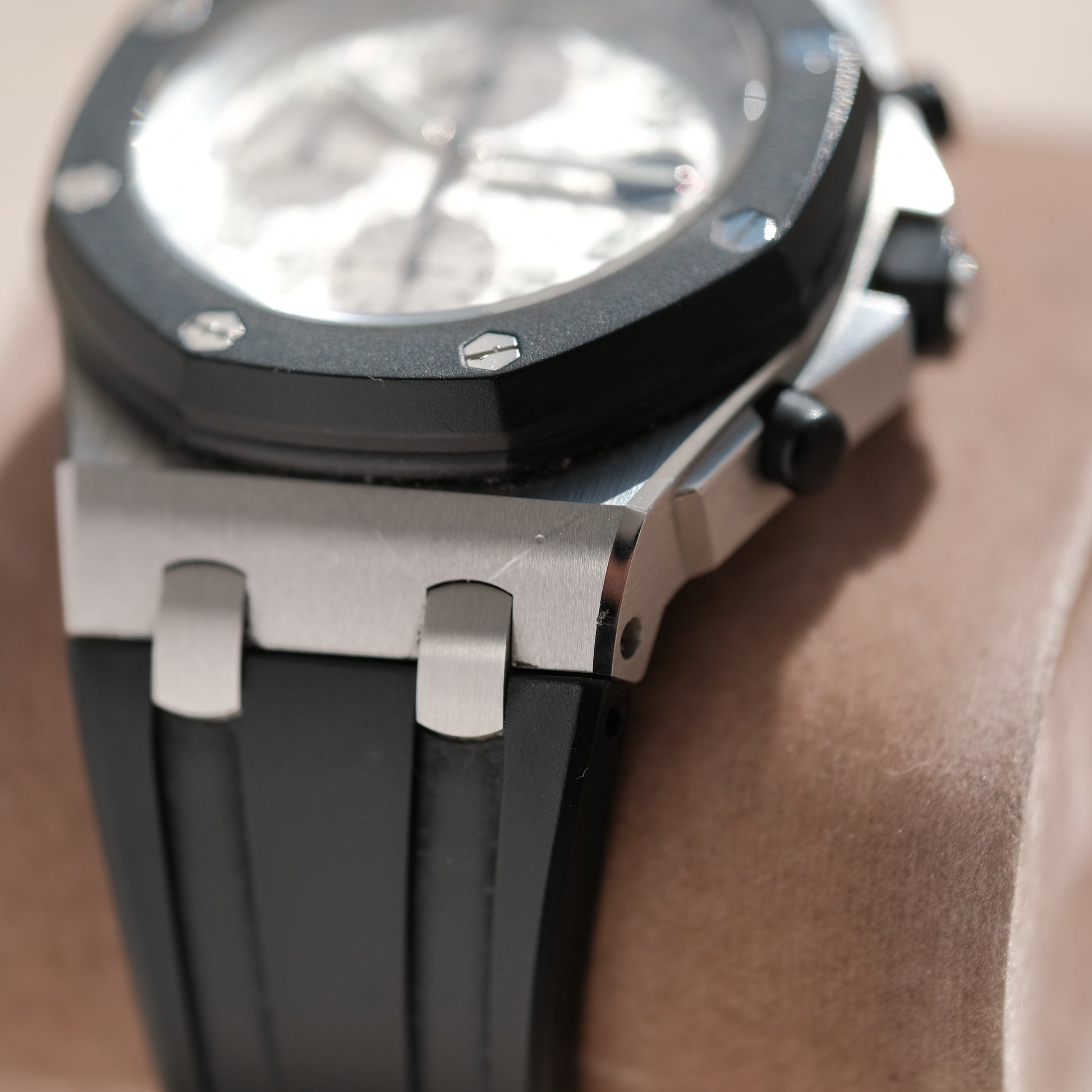 However, while most Rubberclad offshores feature a black dial, this variant features the rarer silver dial treated with the iconic Mega-tappiserie pattern; adding a stark contrast with the matte black bezel