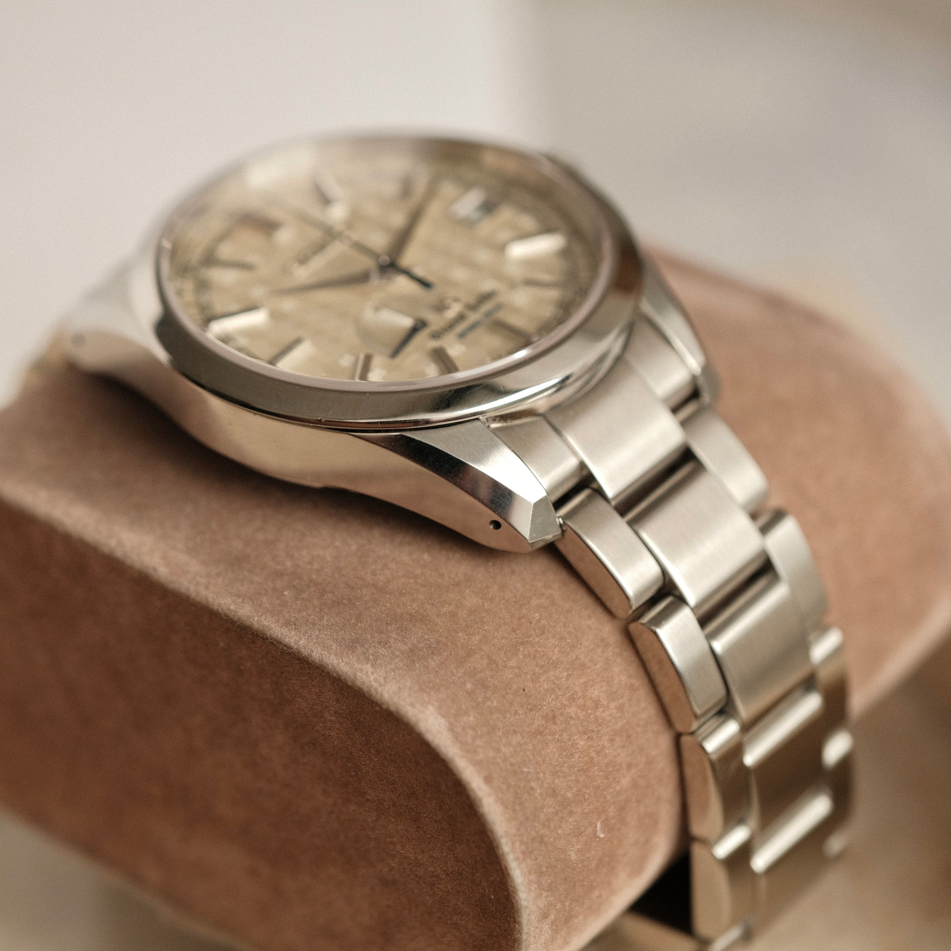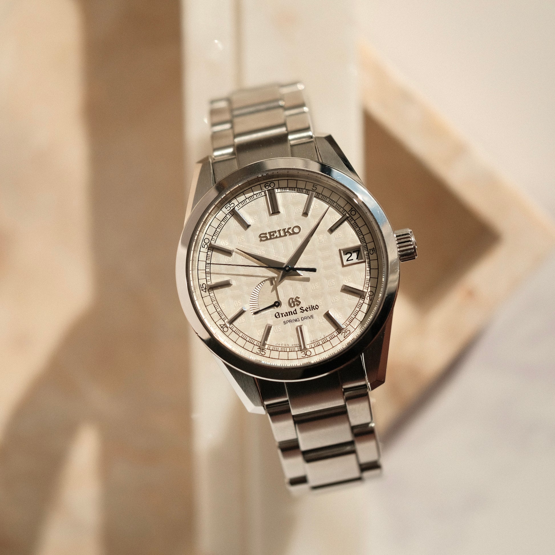 Taking its namesake from the intricate Japanese ‘Tatami’ Mats, this SBGA features an off-white textured dial imprinted with geometric patterns adding a visual depth; with its monogram logo spliced into several sections on the dial.