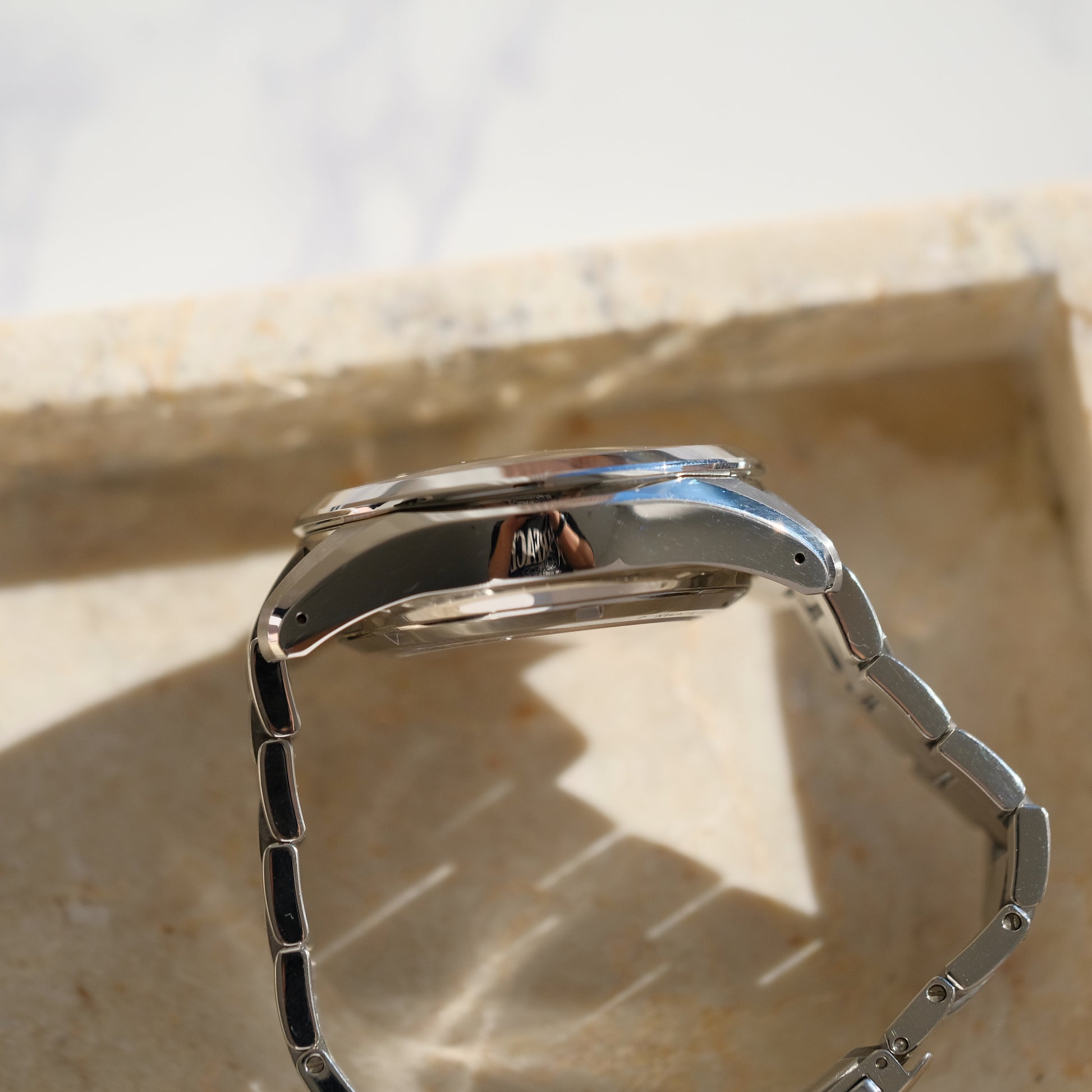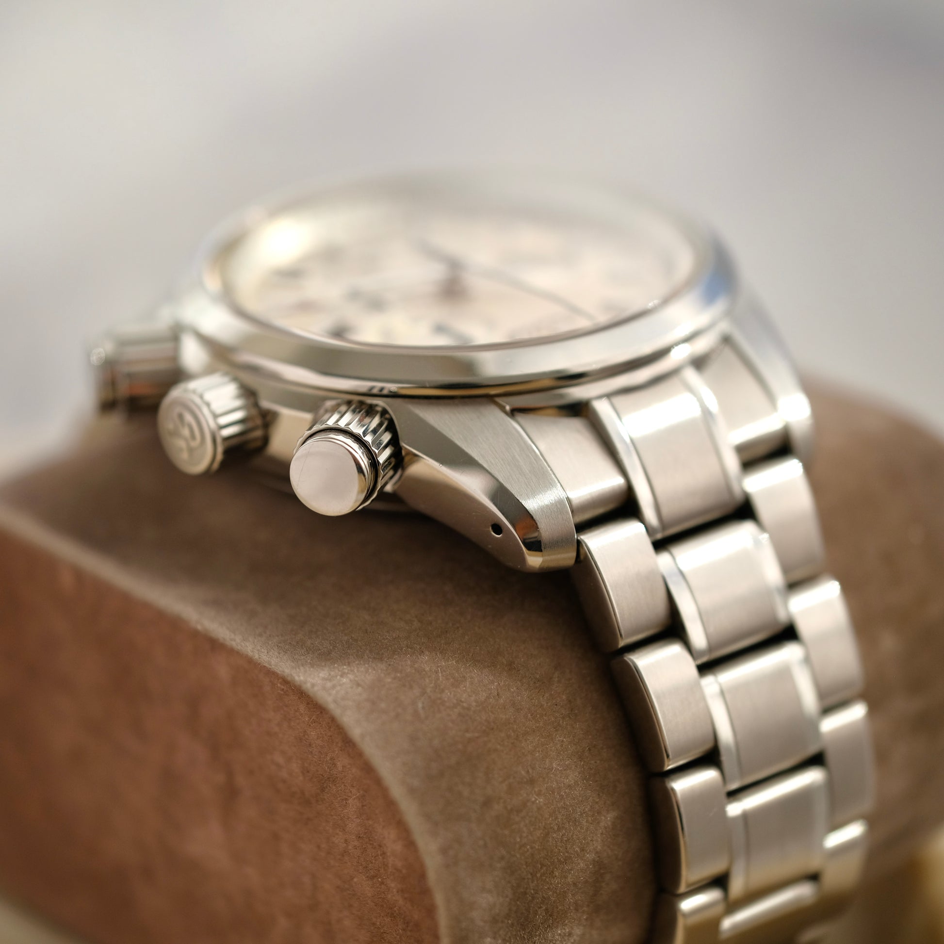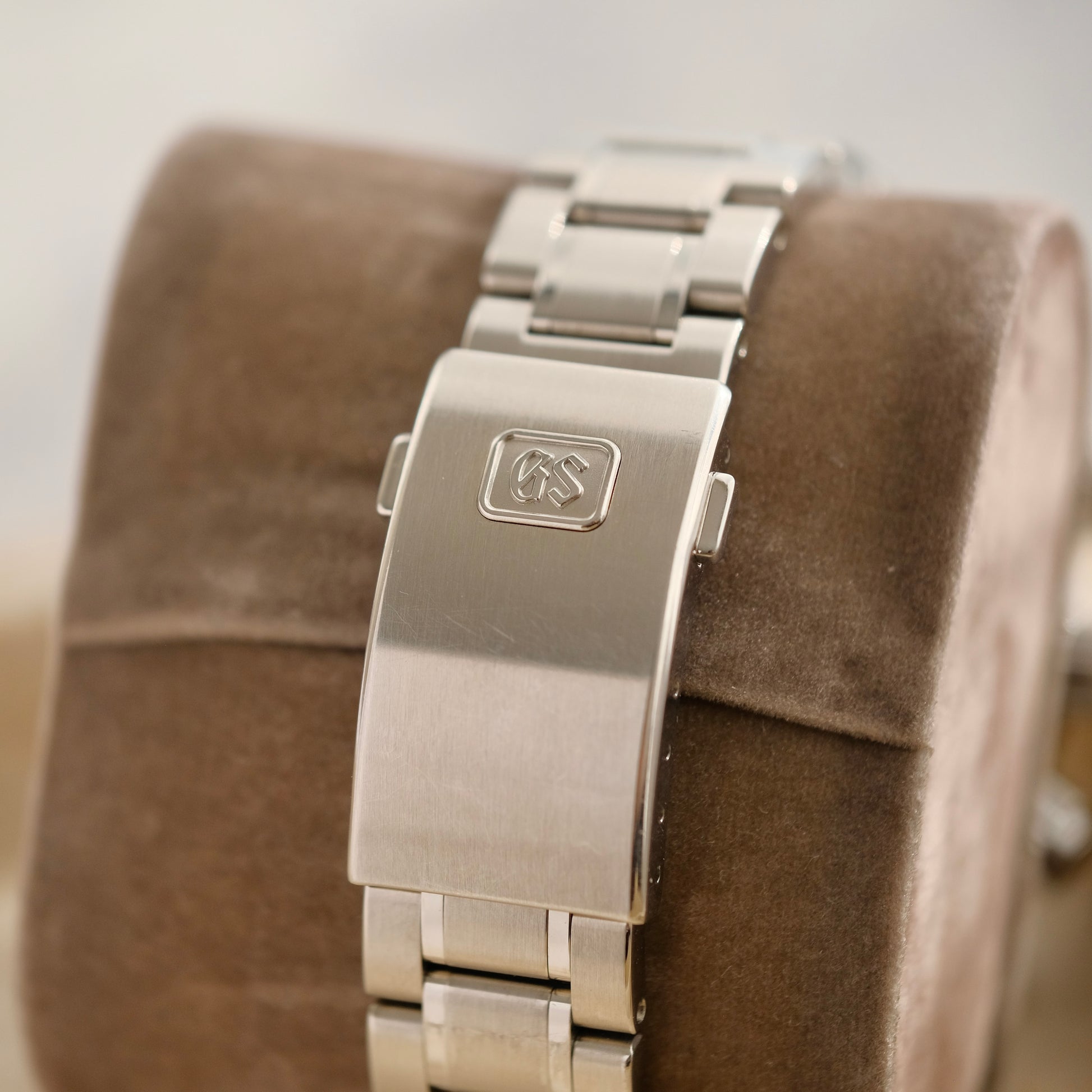 This SBGC001 features the iconic 44Gs case design finished with zaratsu; as well as oversized screw-down pushers - creating a ‘Triple Nipple’ shape to the case flank. While bearing a hefty stature; the bracelet has been tastefully designed to accomodate; featuring the contrasting 5 link finish & micro-adjust clasp.