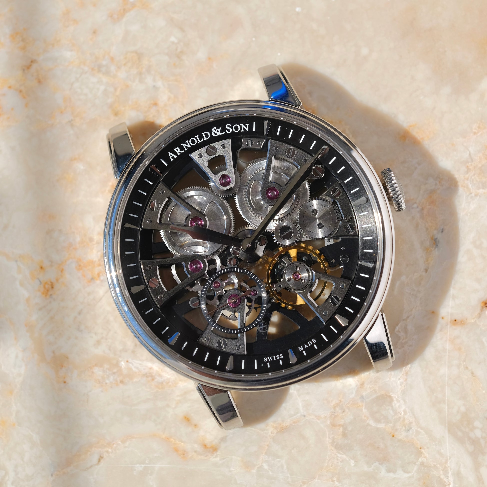 On offer today is a fine, rare & unique skeleton timepiece from Arnold & Sons. The Chronometry Nebula in 41.5mm size, ref 1NEAS.B05A.