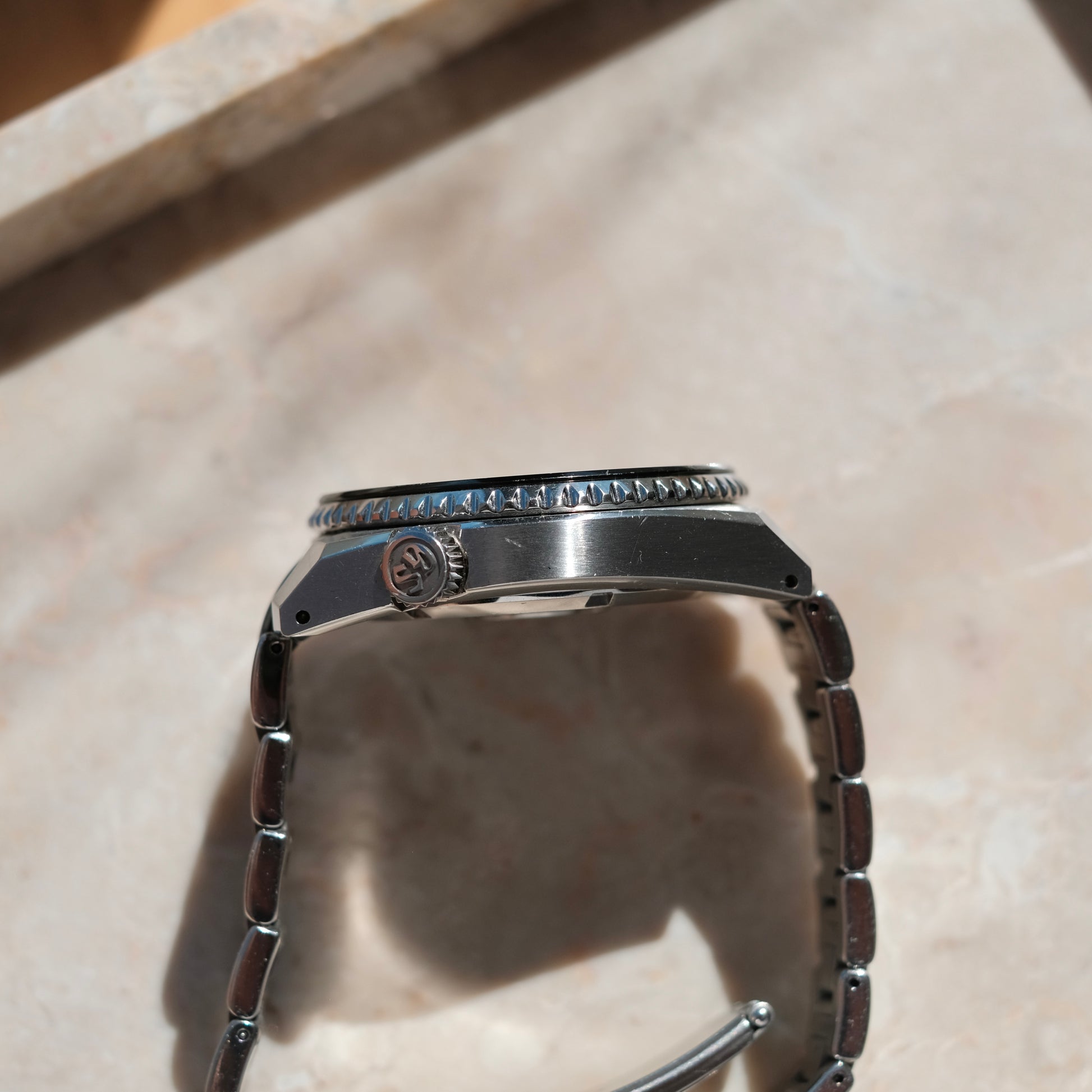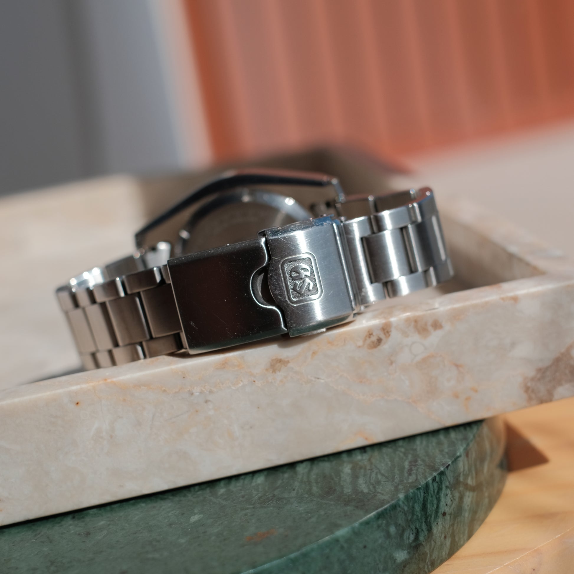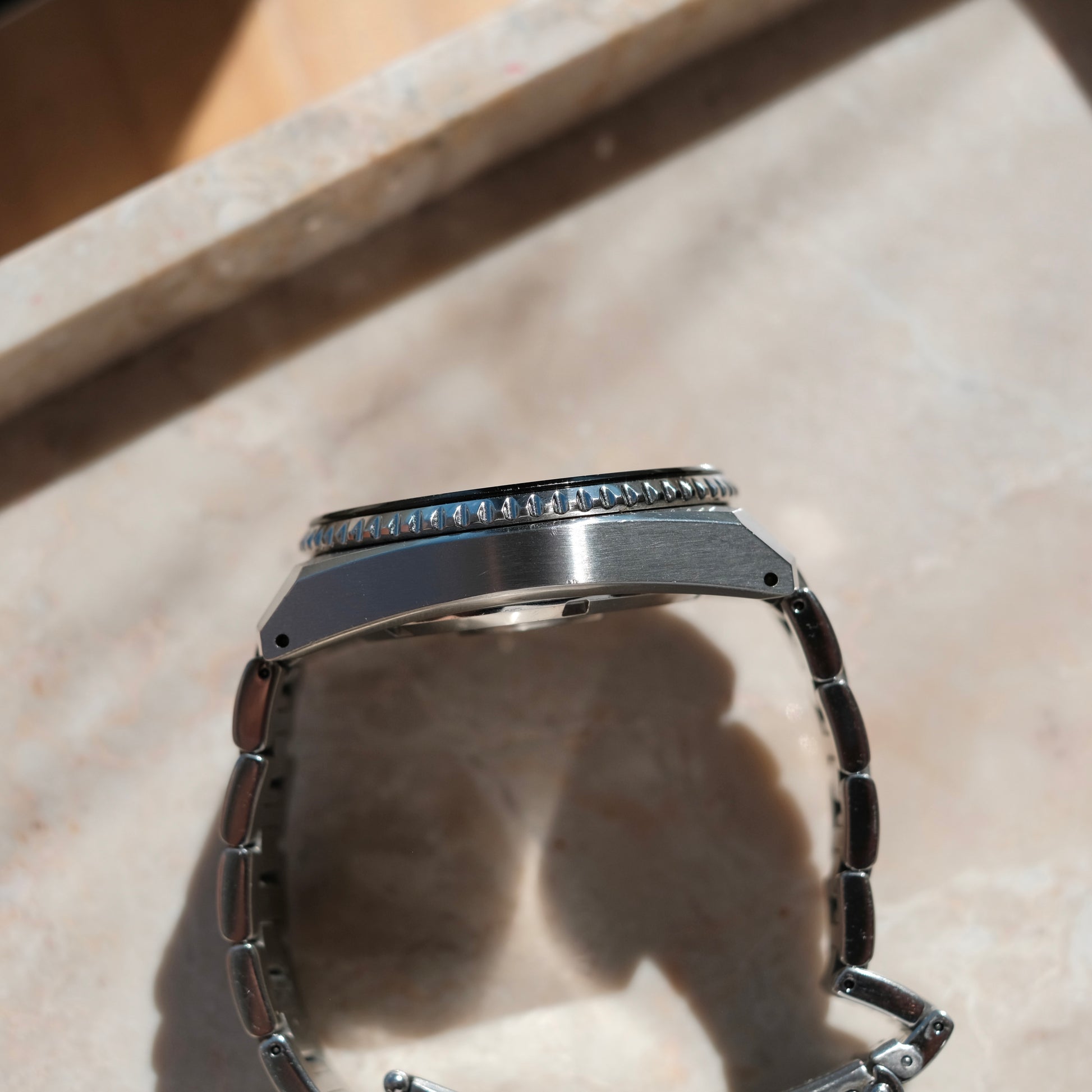 Featuring a large muscular case flank with sharp angles; this fine diver delivers true utility - with a no frills no date display; as well as a movement that’s reportedly accurate to +/- 10 seconds a year. Its a true tool diver’s piece with an added charm.