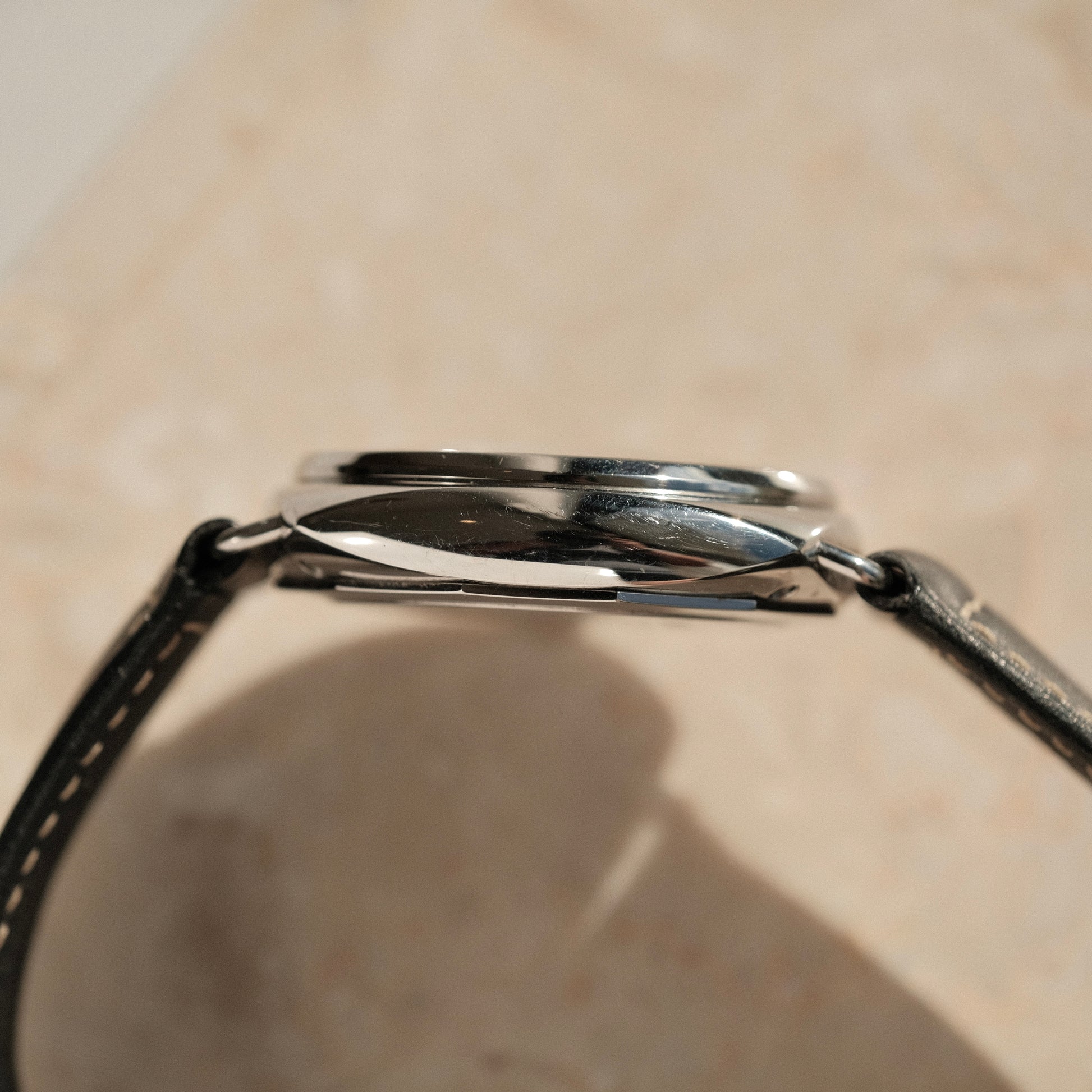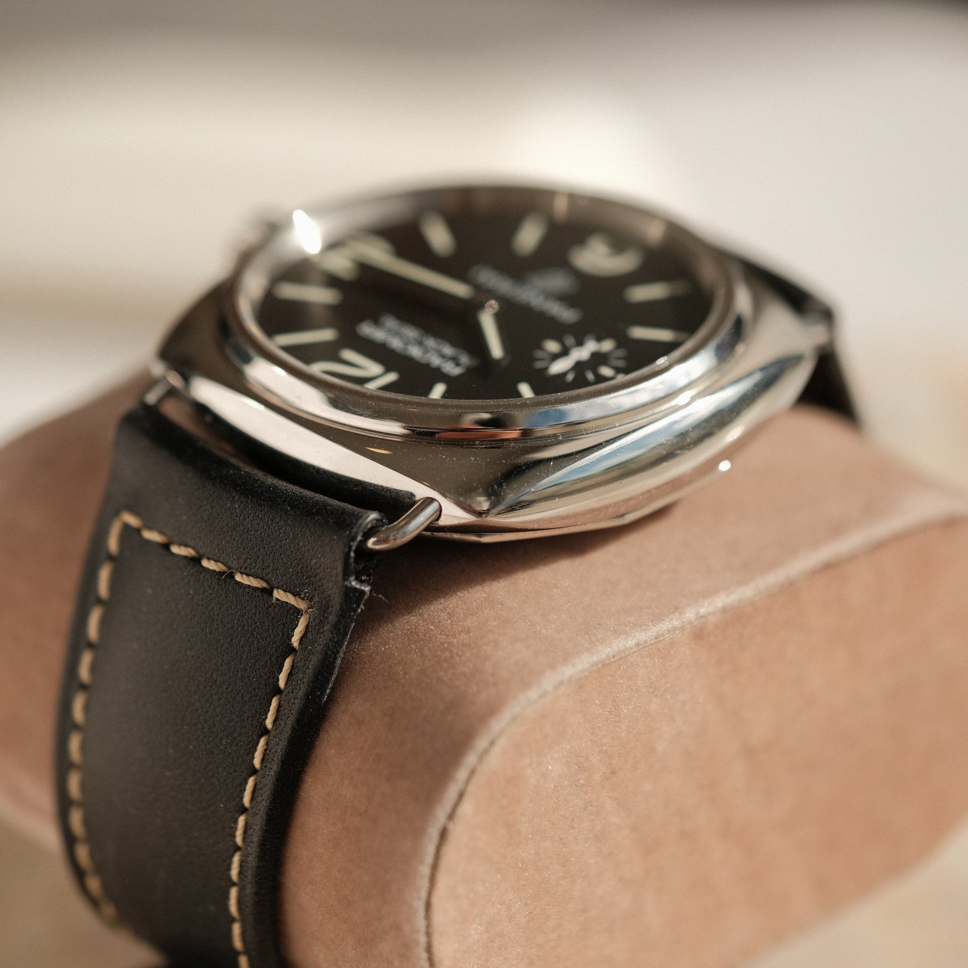 Big, Bold & highly legible; this particular black seal features the classic cushion shape in the classic 45mm size. Paired with a grainy textured dial - and running seconds hand at 9 o’clock. It’s a truly classy piece with its timeless appeal yet rugged heritage, and practical too with a 3 day power reserve.
