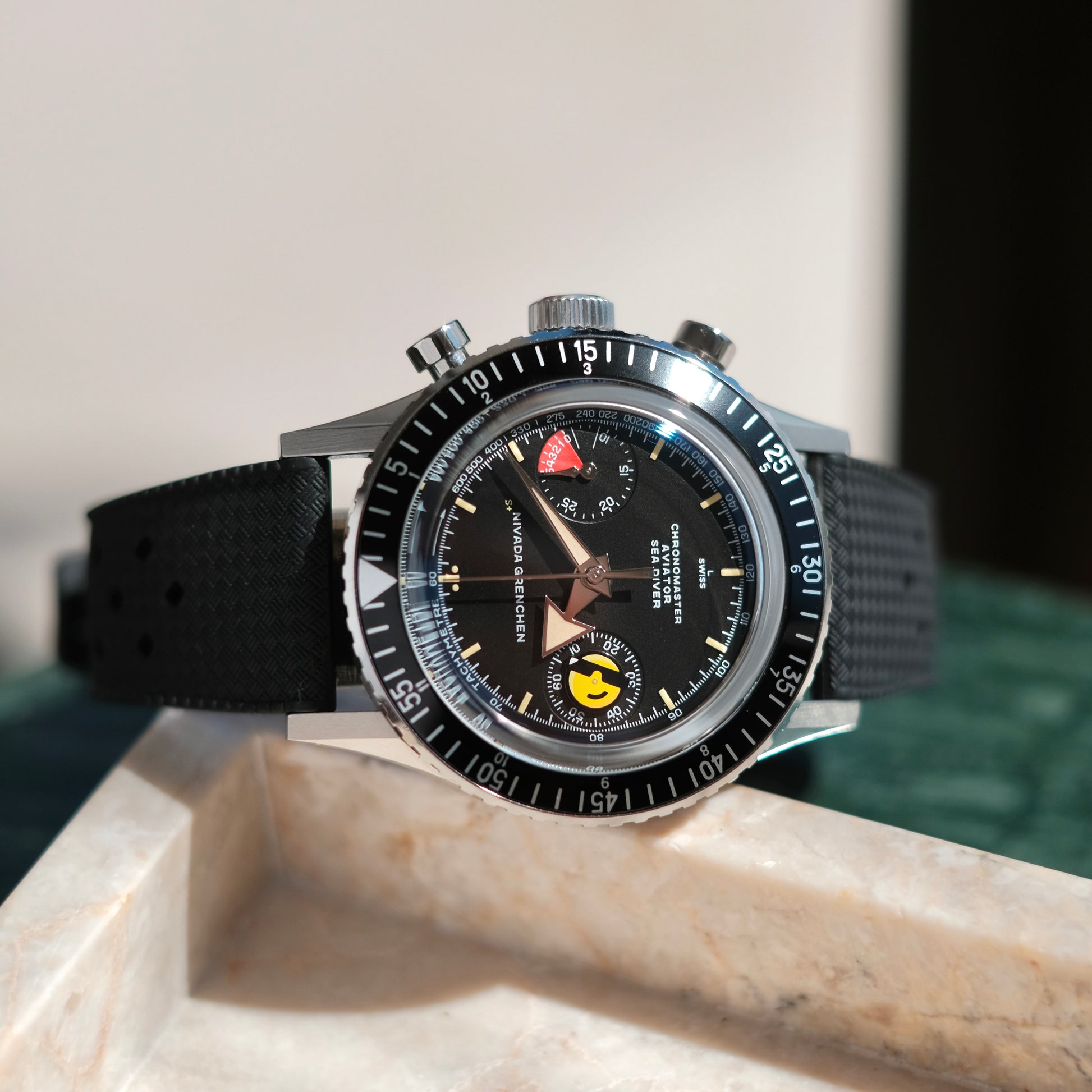 Based on the Chronomaster from Nivada, this ‘Chaosmaster’ has its texts flipped upside down; with the smiley emoji wearing sunglasses rotating as the running seconds hand, a clever play on theatrics.