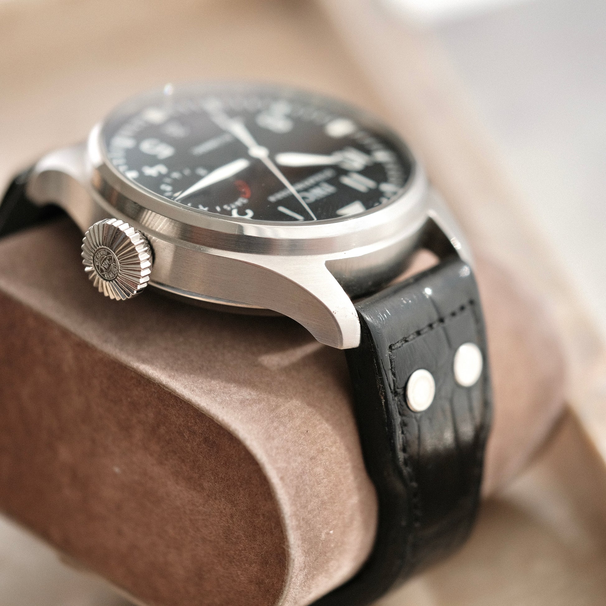 This particular Big Pilot’s watch is dated to 2009 and features its complete double box, booklets & card. The timepiece presents in excellent condition with minor surface level scuffs & scratches, a minor hairline on crysal , and has been polished in the past.