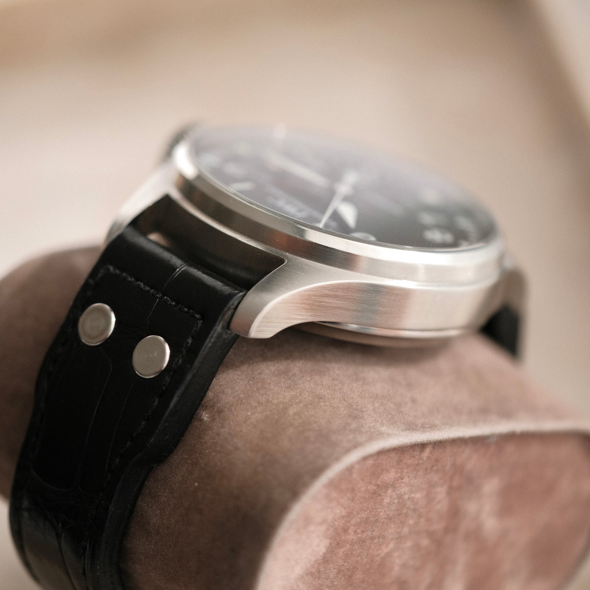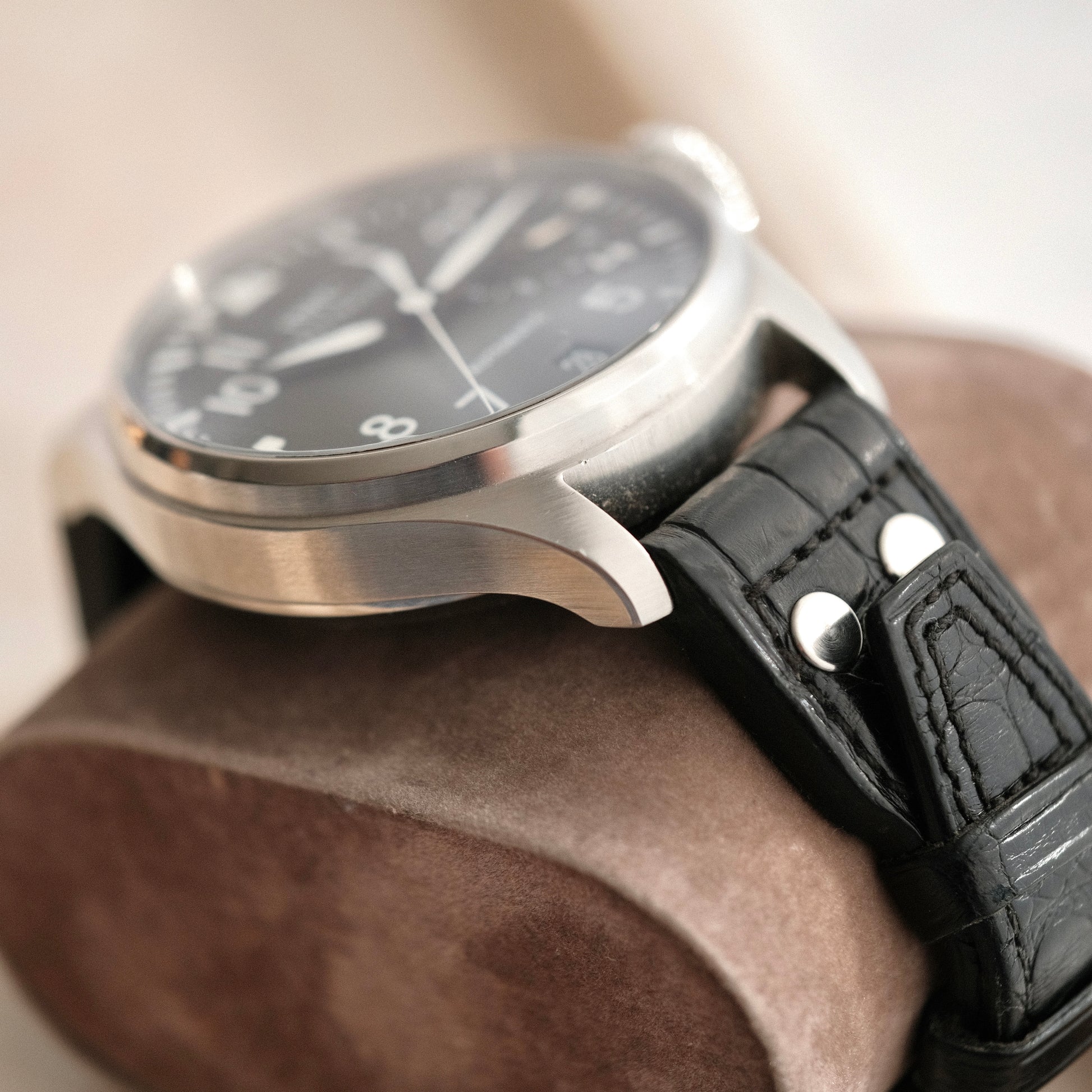 Retaining many features of the original Fliegers such as the 'Type-A' dial configuration, the gigantic crown & the antimagnetic Faraday cage internal to the piece; this big pilot sizes down to a much more wearable yet massive 46mm case size.