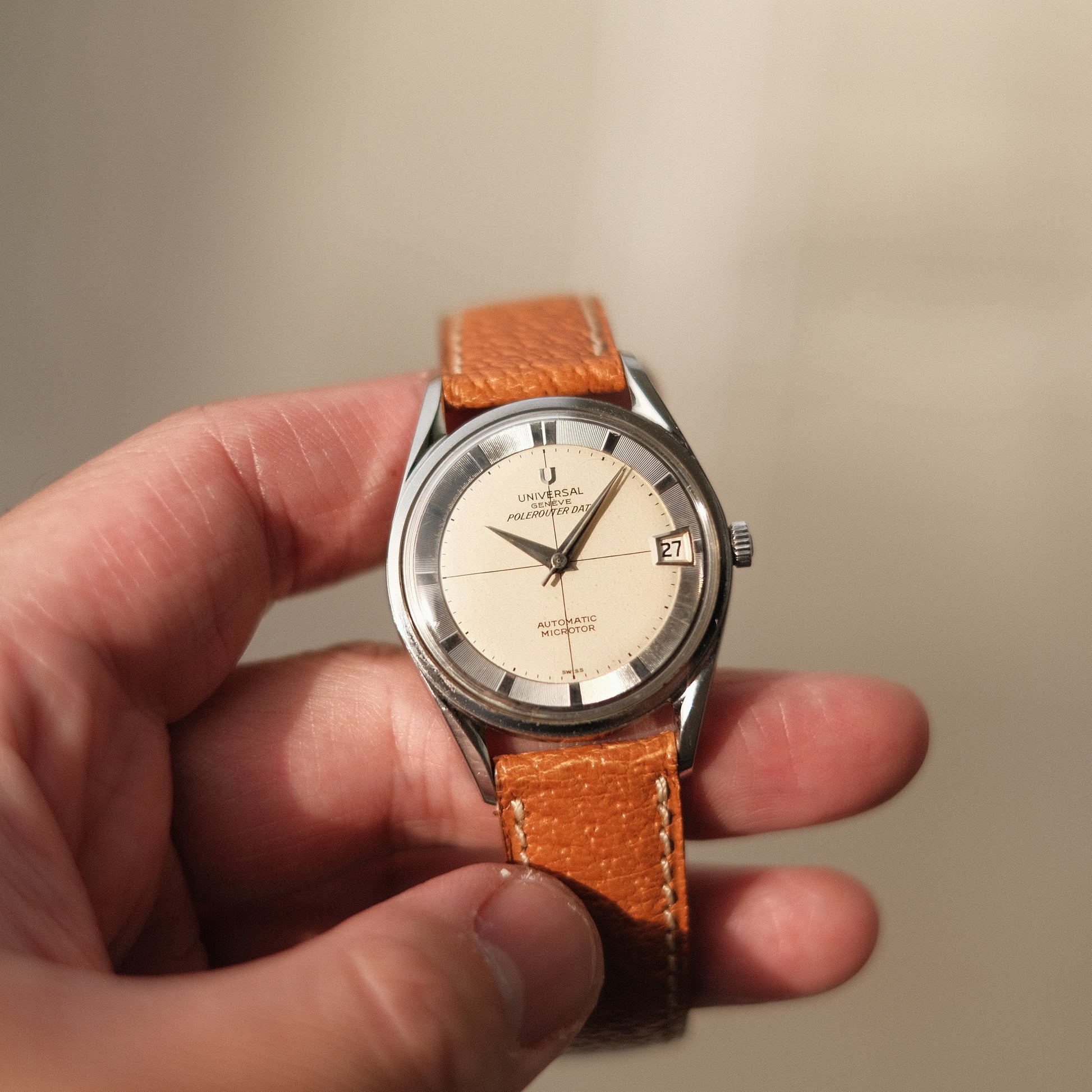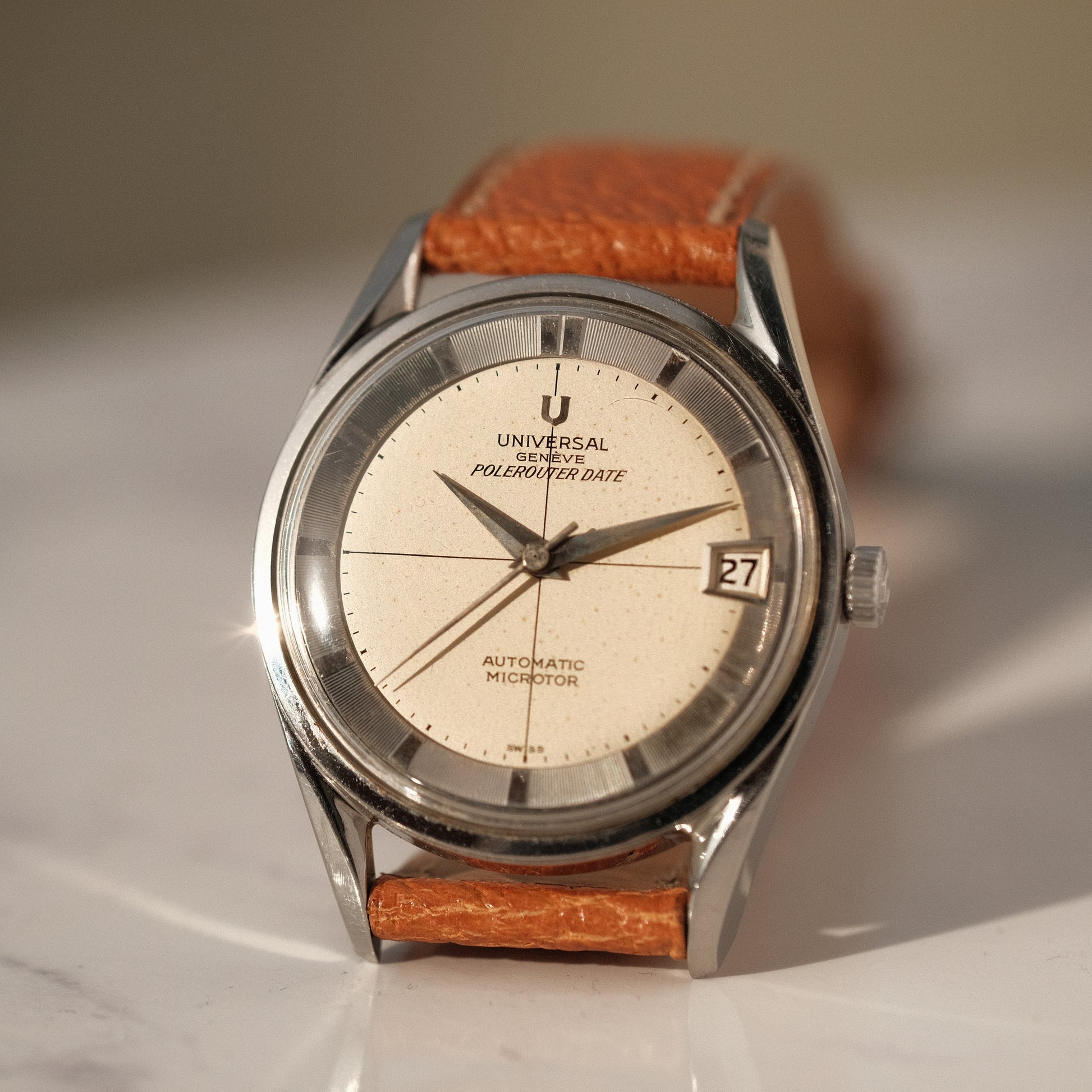 On offer today is a timeless & legendary pilot’s piece from Universal Geneve, the Polerouter Microrotor ref 204610-3 featuring a stunning mildly patina’d cream dial.