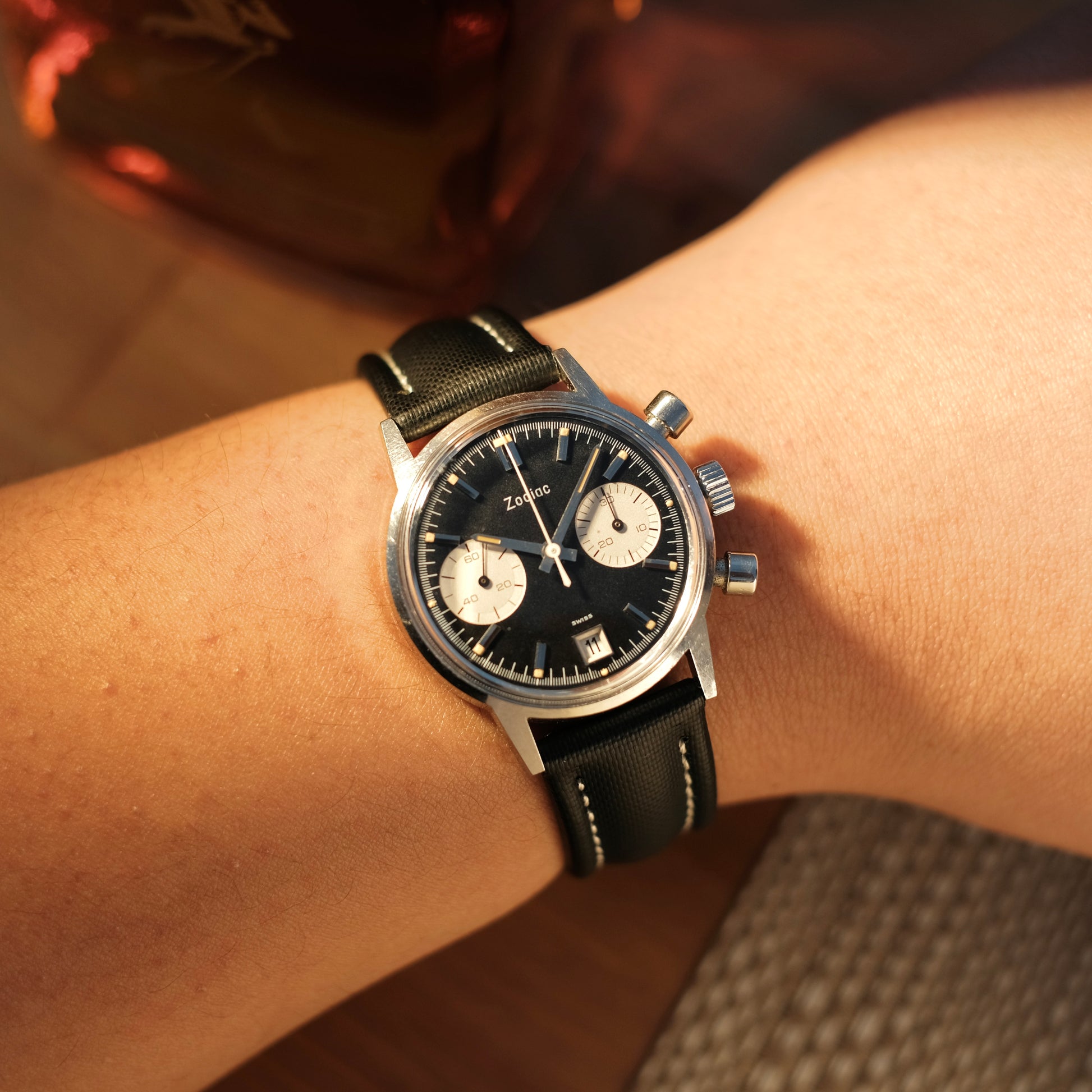 While chronographs from the 60’s are undeniably cool; this Zodiac 7823 encompasses a timeless aesthetic with a dual register configuration with a date at 6 - with stunning orange patina on the dial & hands adding a touch of character.