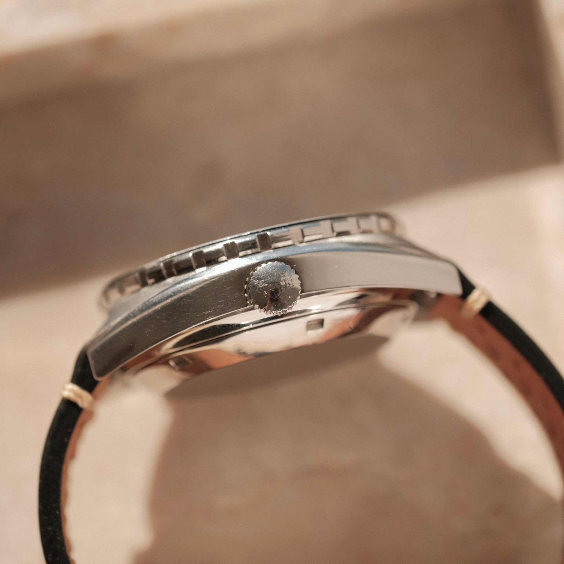 This Particular Orange boy features a stunning gray dial with patina on the indexes, as well as visible lume rot on the hands; the upper half of the case retains its sharp graining while crown & bottom pusher has been visible tarnished, bezel has wear commensurate with age.