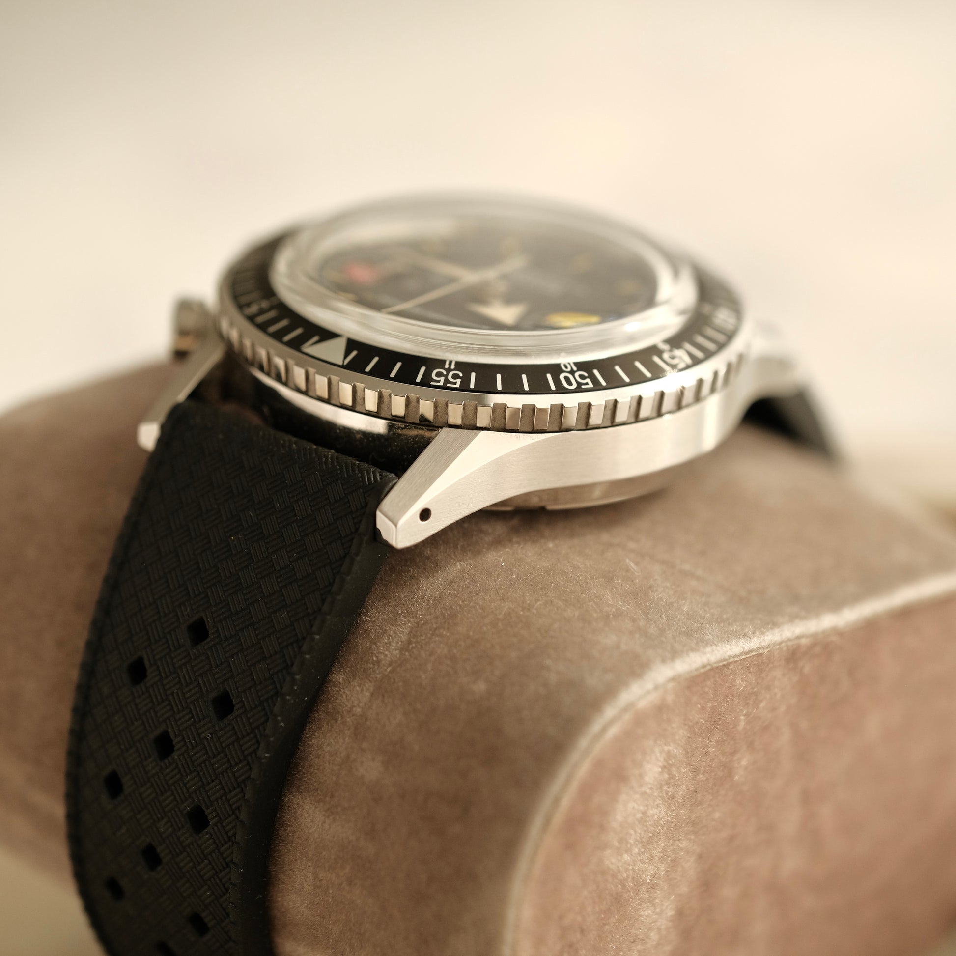 Featuring a stunning creamy shade of fauxtina on the dial & hands, this Manual Wind chronograph is a near perfect execution with a 38.3mm case & a domed crystal; a configuration vintage connoisseurs are sure to appreciate.