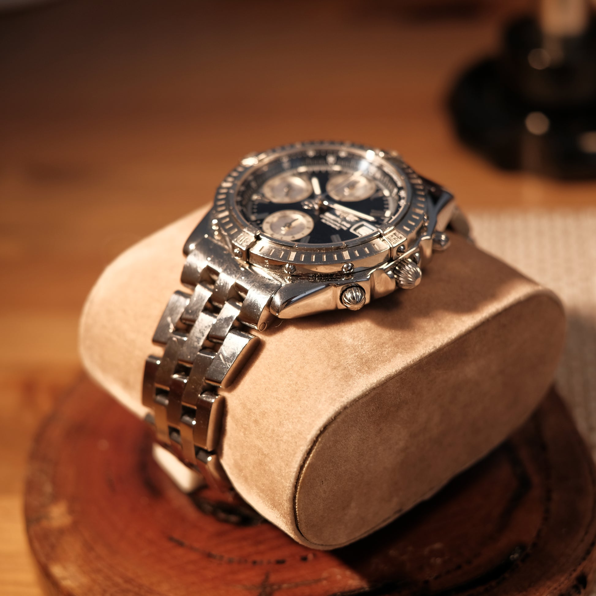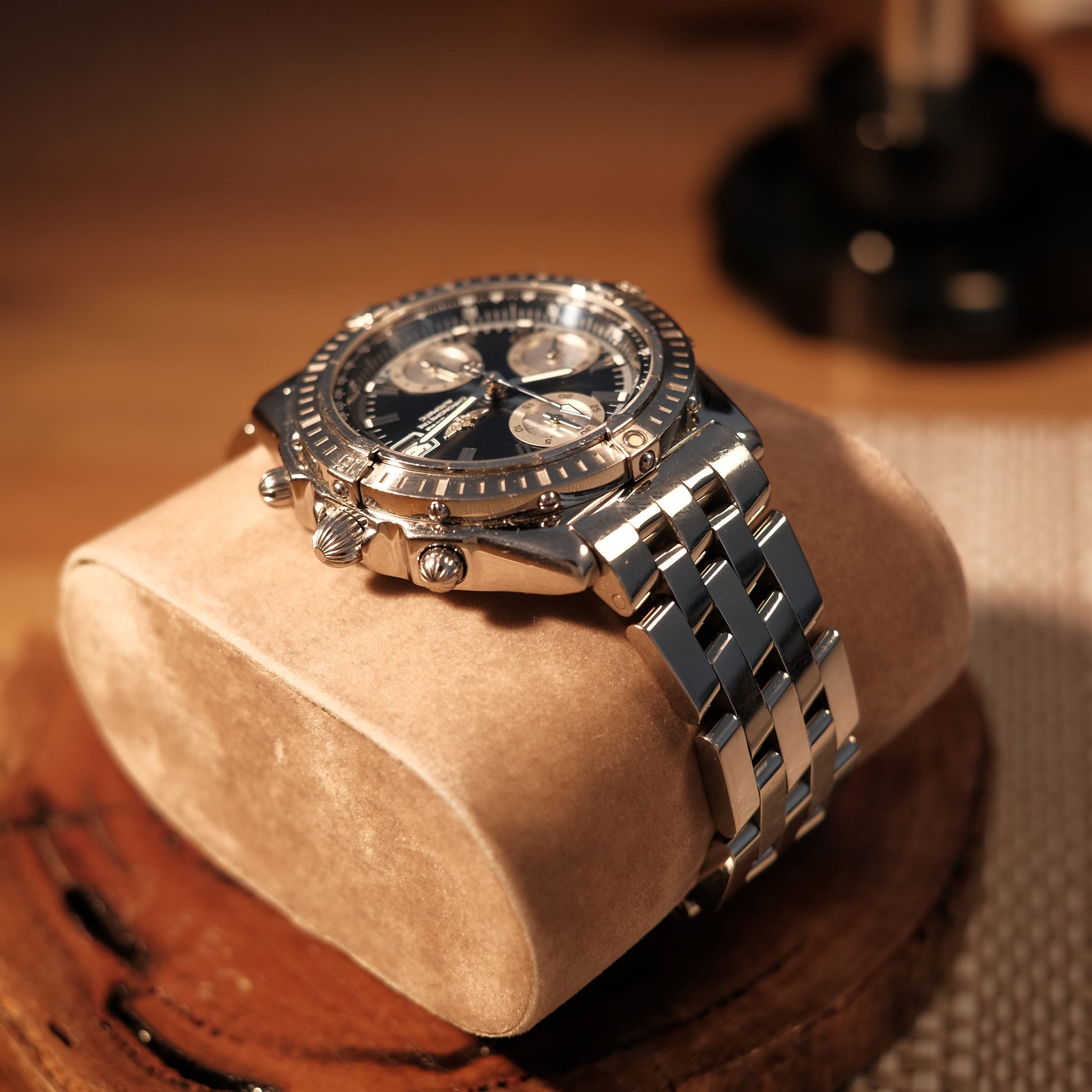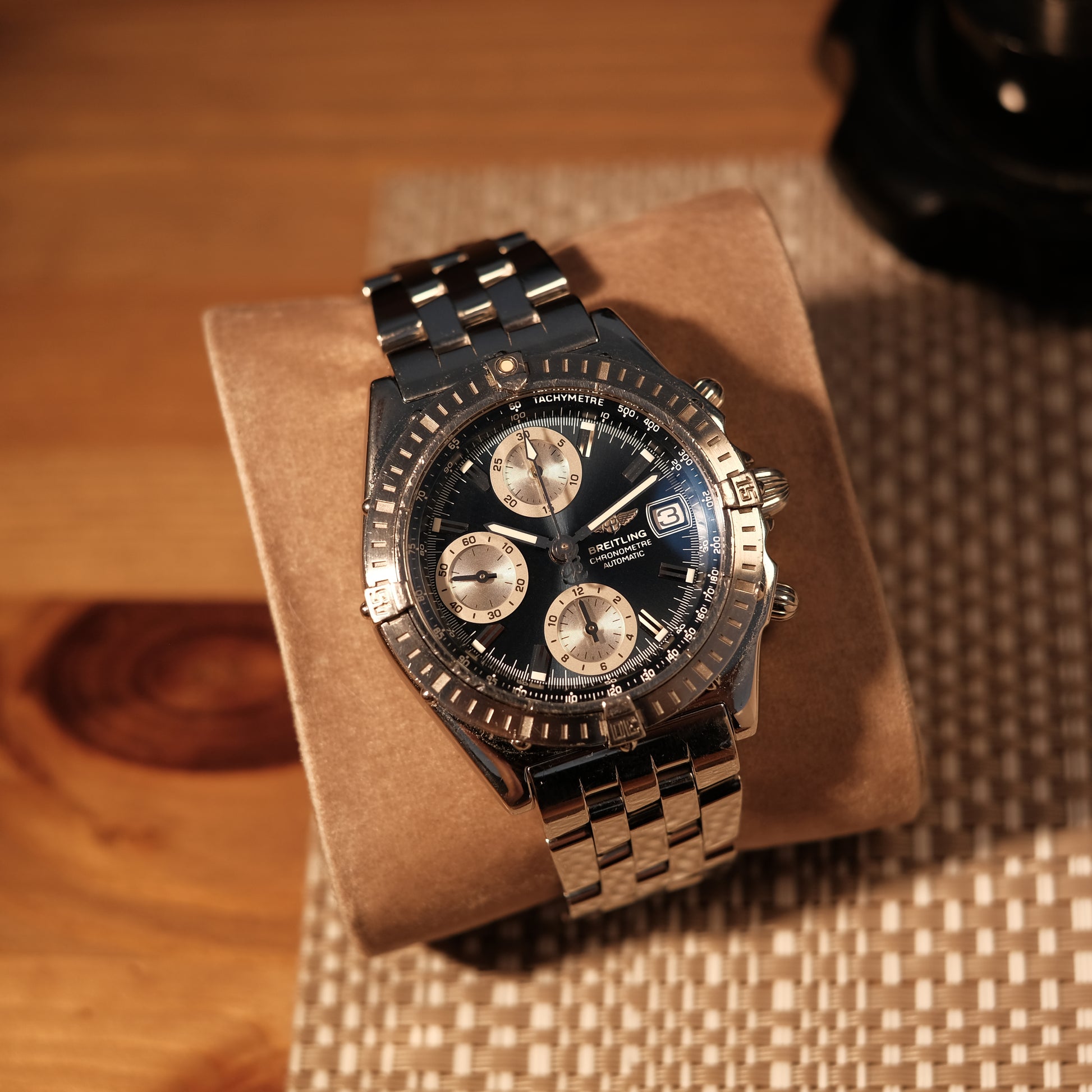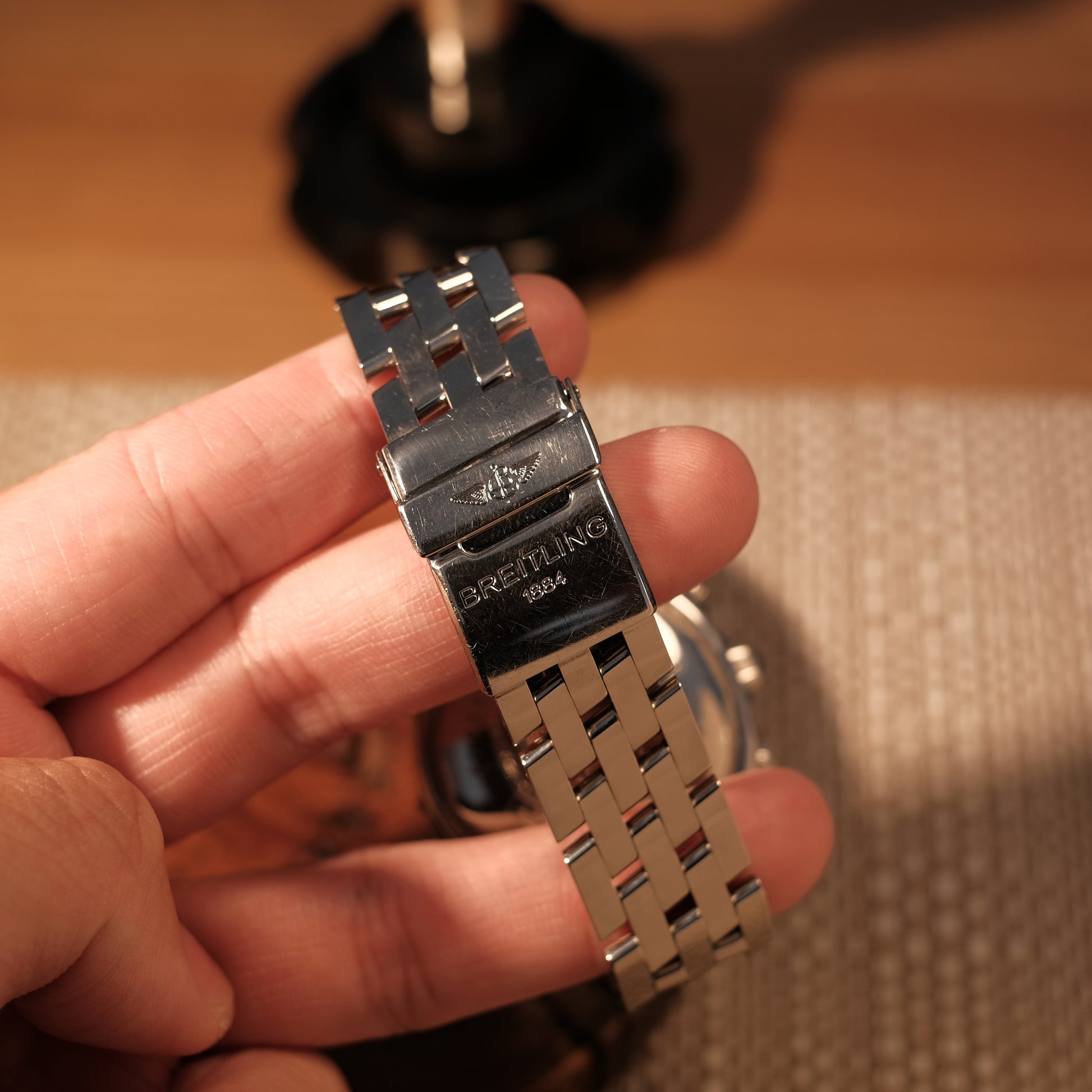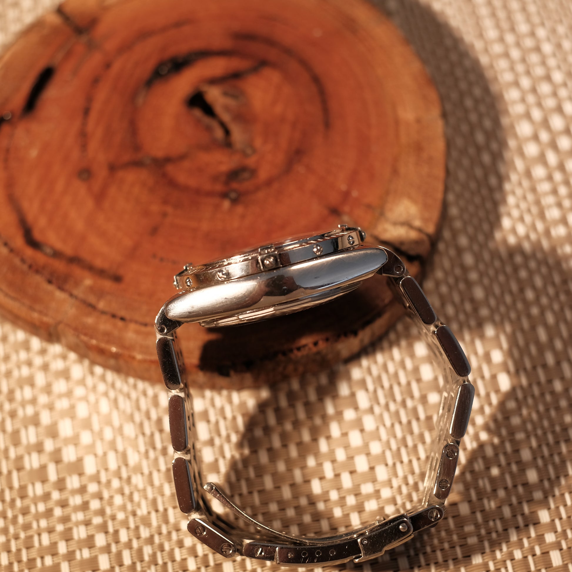 A quintessential example of the brand’s rugged, tool watch era from the late 1990s and early 2000s. The A13352 wears more comfortably on the wrist than its modern, oversized successors; with the blue sunray finish that creates a striking contrast against the high-polish steel case and the signature rider tabs on the bezel.