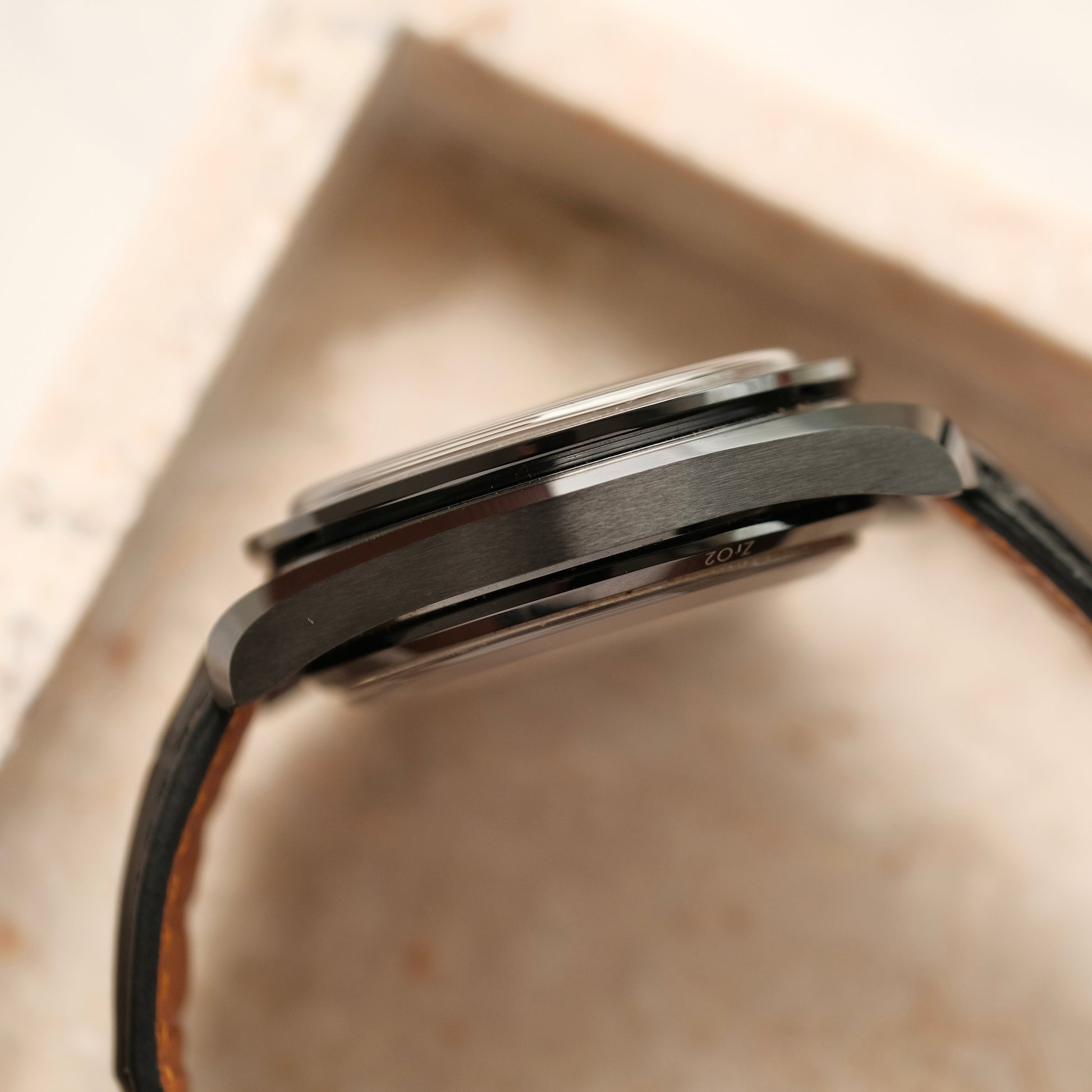 Subtly displaying chemical symbol for technical ceramics [Zr02] just above the cannon pinion; this timepiece also features the lyre-lugged case iconic, with every brushed & high polished surface executed to perfection.