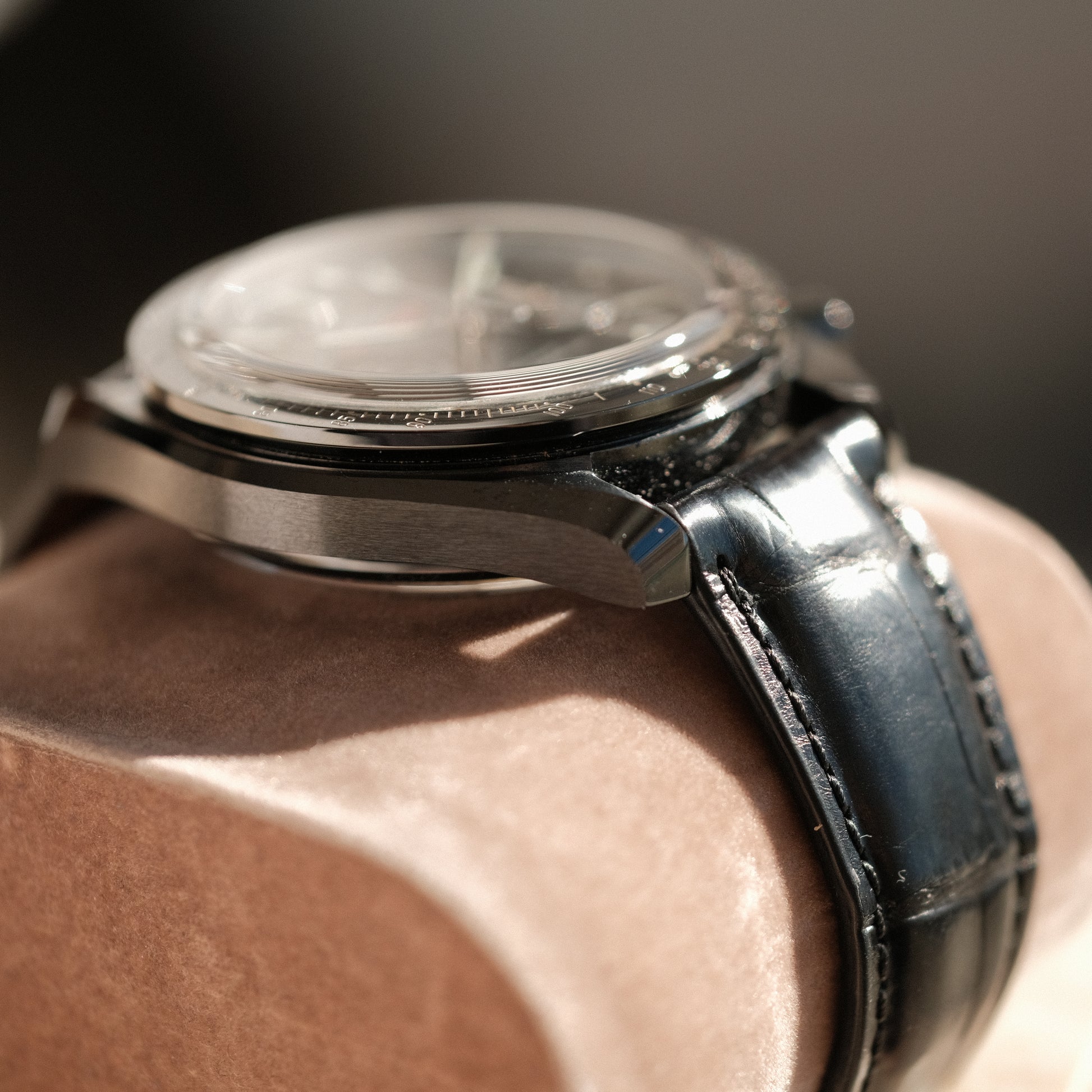 Featuring the calibre 9300, this timepiece features a neat chronograph layout, with the right sub-dial containing both the minute & hour counters; as well as the date window at three and a jumping-hour hand complication for travelling. Did I mention all of this is displayed with a domed sapphire display case-back?